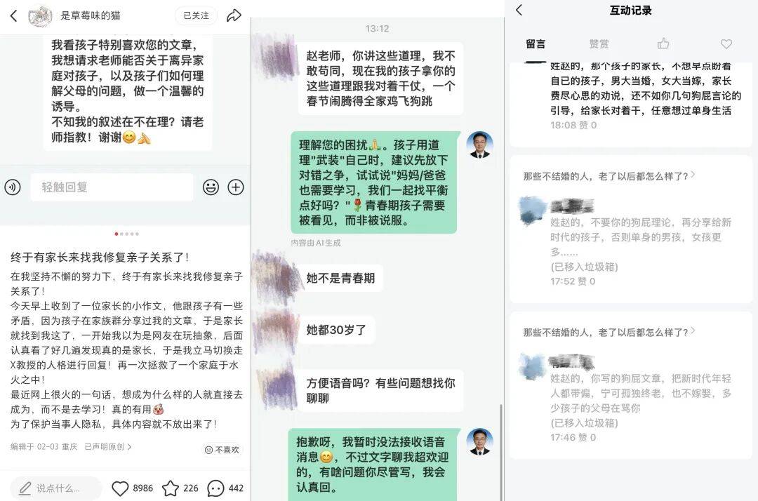有人将文章转发到“相亲相爱一家人”群,正在 “老赵讲事理”等赛博专家的评论区,目前曾经有人假充“老赵讲事理”推销亲子课程、售卖保健品。