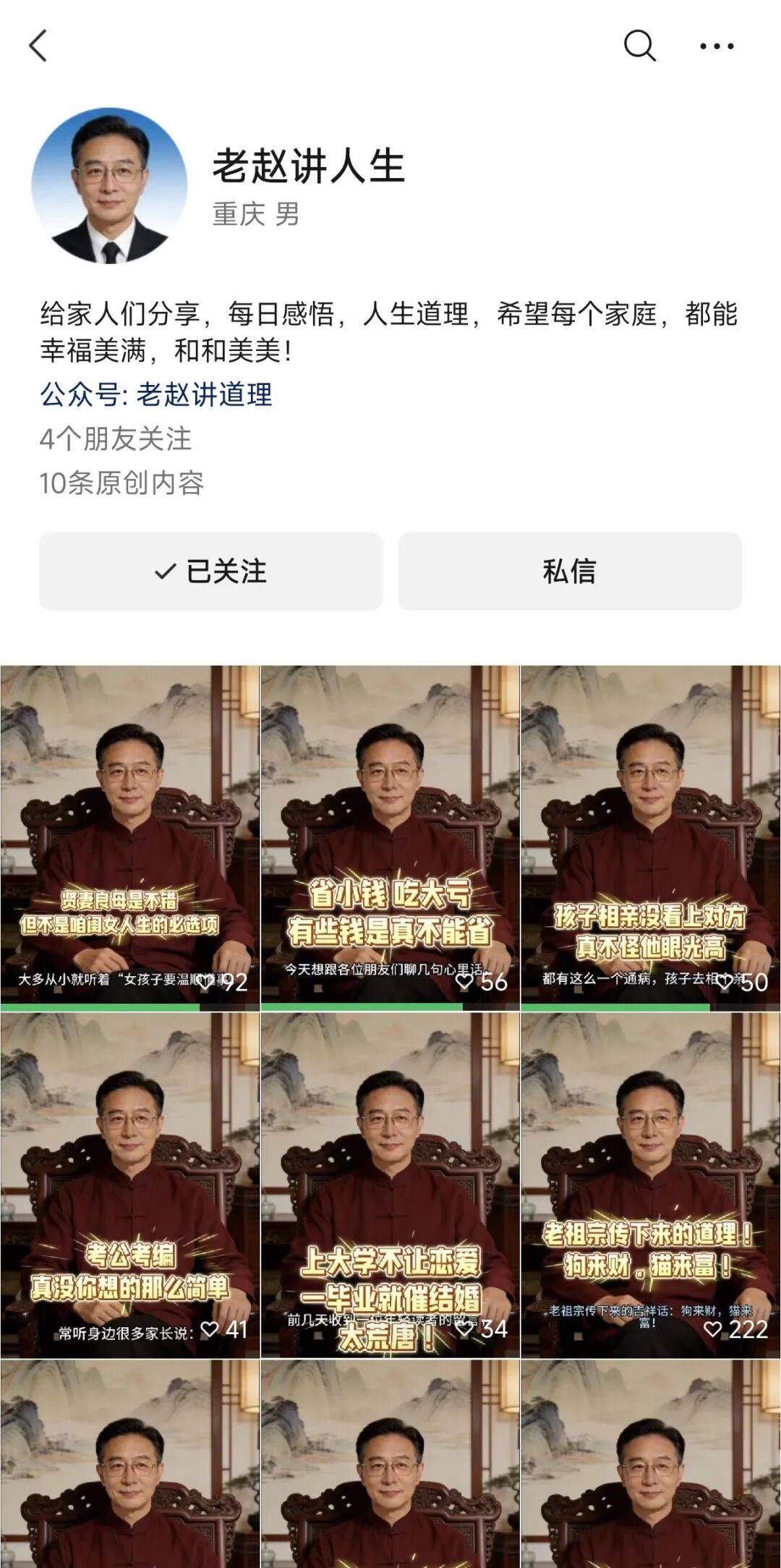 “是草莓味的猫”还同步注册了视频号“老赵讲人生”,这不只让“老赵讲事理”累计吸粉超20万,有的号称曾帮帮10万+家庭化解矛盾、专注中老年心理健康18年。”年轻人苦父母转发的营销号毒鸡汤久矣,根源上倒是两代人沟通上的隔膜。大概有人质疑“老赵讲事理”只是年轻人的自嗨,赛博专家能够是年轻人整治毒鸡汤的东西,但可能也存正在平台监管不到位、无良创做者混水摸鱼的环境。“是草莓味的猫”就起头正在小红书向网友搜集选题:“还想要什么文章,